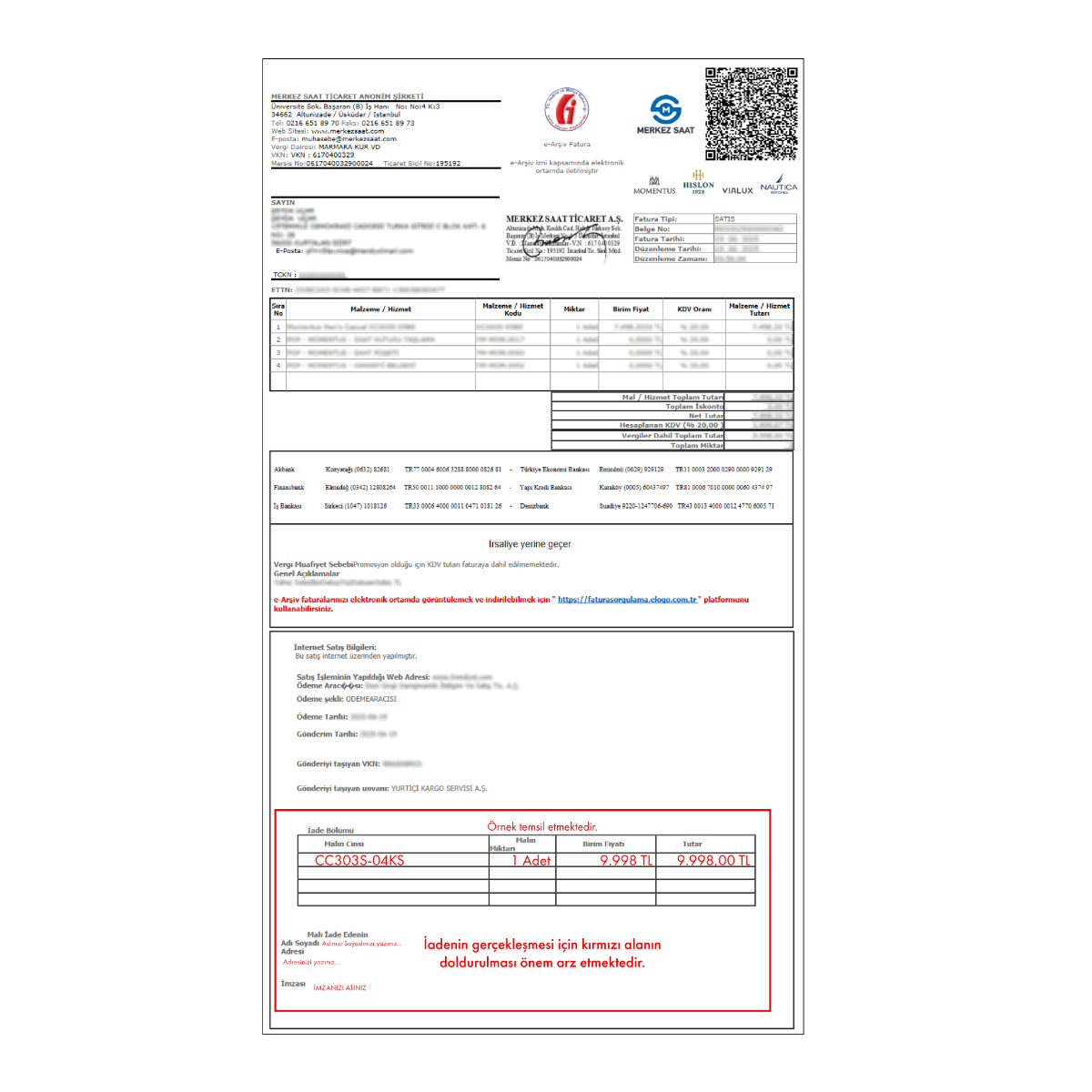 İade adresimiz: Merkez Saat Tic. A.Ş. : Altunizade Mah. Kısıklı Cad. Üniversite Sok. Başaran(B) İş Hanı No:4/5 34662 ÜSKÜDAR/İSTANBUL